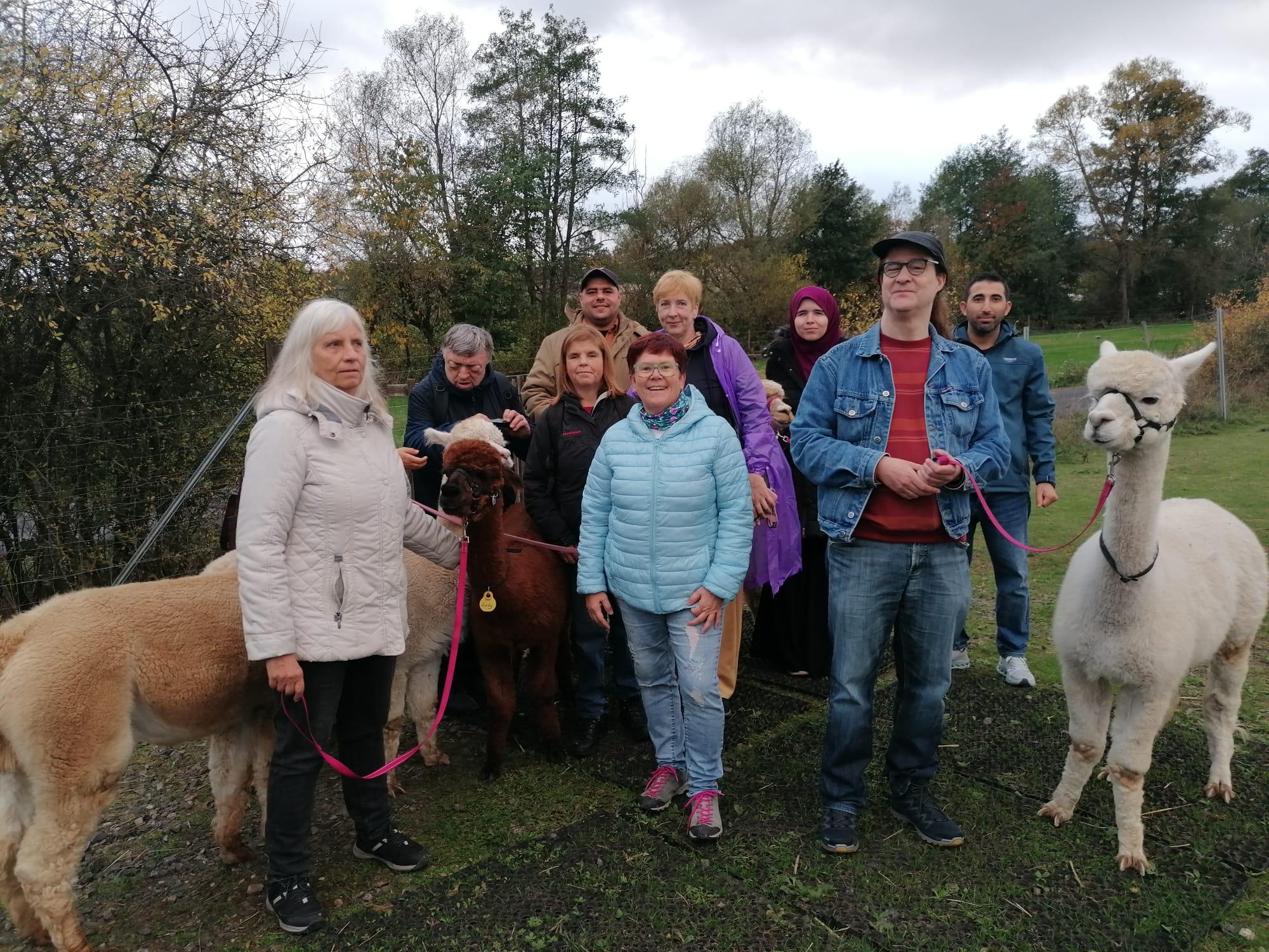 9 Projektteilnehmende besuchten am 16.10 die Alpakas in Sterzhausen und machten – nach einem kurzen Kennenlernen – eine 1,5-stündige Wanderung durch die Natur. 2 Blindenführhunde waren mit dabei, mussten aber fern der Alpakas betreut werden, weil die rechtkleine Kamel-Art die Gegenwart von fremden Hunden nicht gut findet. Es war ein voller Erfolg, diese interessanten Tiere einmal persönlich zu treffen und einige Infos über sie zu erfahren.